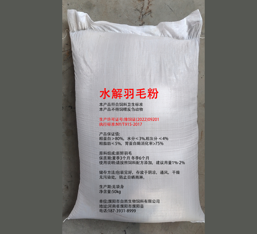 水解羽毛粉本产品符合饲料卫生标准本产品不得饲喂反刍动物生产许可证号:豫饲证(2022)09201执行标准:NY/T915-2017产品保证值:粗蛋白≥80%,水分≤3%.粗灰分 ≤4%粗脂肪≤5%,···