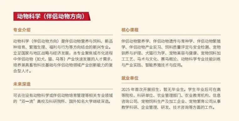 该专业的招生放在中国农大“动物科学”大类下◈◈,专业方向为“动物科学(伴侣动物)”◈◈,专业代码090301◈◈,学制4年◈◈,毕业生将被授予“农学学士学位”◈◈。